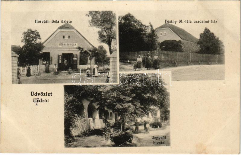 1913 Uzd, Uzdborjád (Sárszentlőrinc); Jegyzői hivatal, Pesthy M.-féle uradalmi ház, Horváth Béla üzlete (fl)