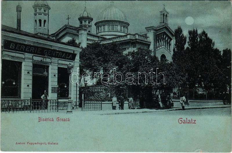 Galati, Galatz; Biserica Greaca, Restaurant, Bererie Centrala / Greek Church, restaurant and beer hall. Edit. Anton Pappadopol (r)
