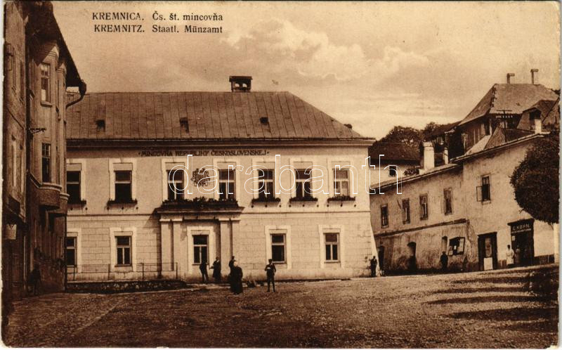 1924 Körmöcbánya, Kremnitz, Kremnica; Cs. st. mincovna / Staatl. Münzamt / Pénzverde, E. Kohn üzlete / mint office, shop (EK)