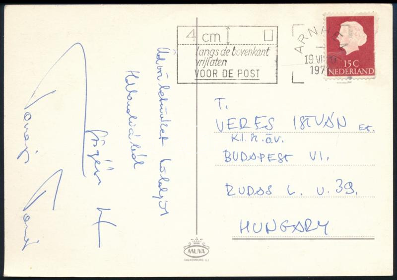 1971 Faragó Tamás (1952- ) olimpiai, világ- és Európa-bajnok vízilabdázó, edző autográf aláírása Hollandiából hazaküldött képeslapon + egy további aláírás (Görgényi István?)