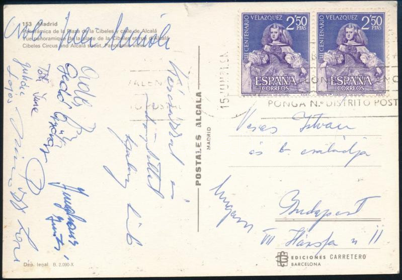 Description: Magyar ökölvívók (bokszolók) autográf aláírásai Spanyolországból hazaküldött képeslapon, össz. 8 db: Papp László (1926-2003), Gedó György (1949- ), Adler Zsigmond (1901-1982), Szalay László, Tóth Imre, Juhász Lajos, Junghaus Gusztáv + egy további