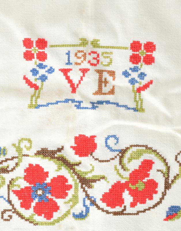 1935 Monogramos díszterítő. Keresztszemes hímzéssel, foltokkal, cca 95x57 cm