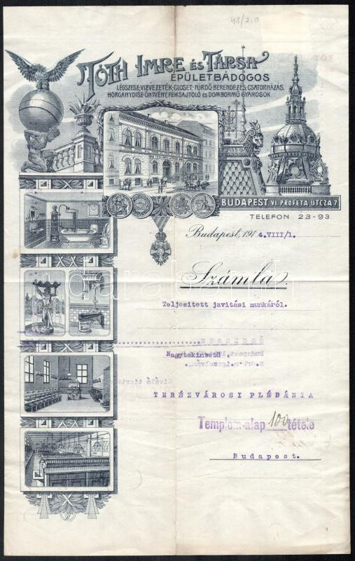 1914 Bp., Tóth Imre és Társa épületbádogos dekoratív fejléces számlája a terézvárosi plébánia részére, 2f okmánybélyeggel