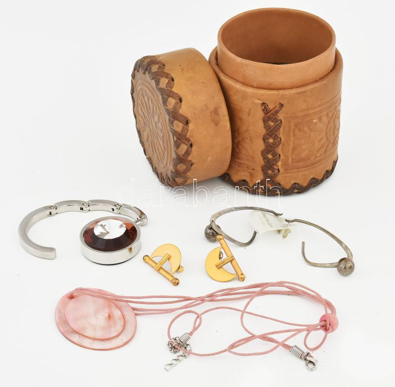 Dombornyomott mintás kerek bőrdoboz, benne néhány vegyes bizsu, m: 11 ...
