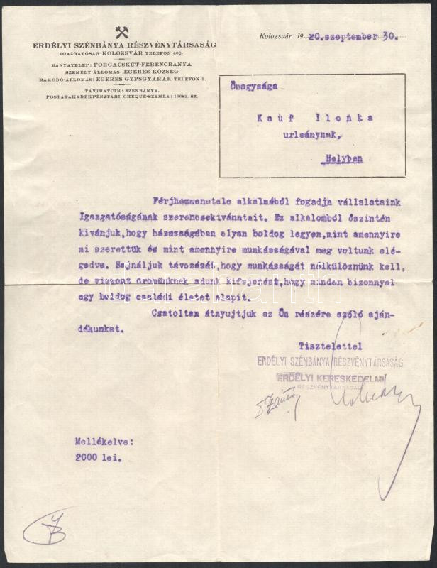 1920 Kolozsvár, Erdélyi Szénbánya Rt. gratuláló levele házasságkötés alkalmából, fejléces papíron, bélyegzésekkel