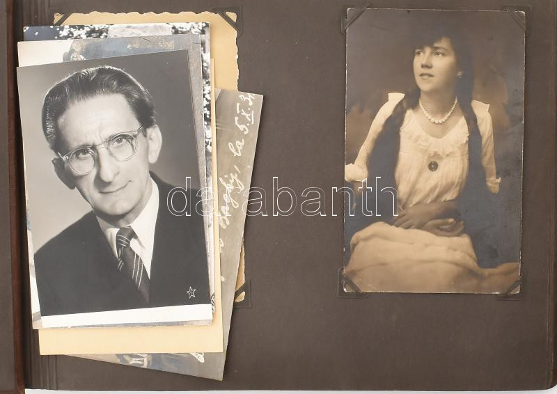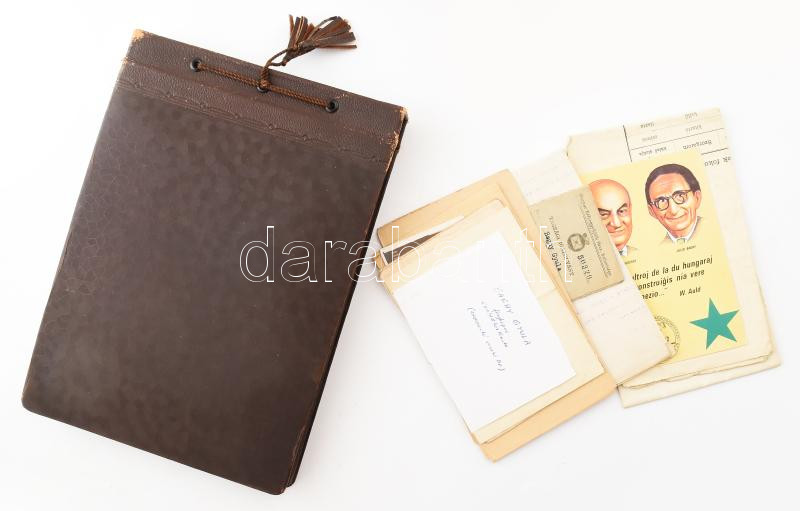 cca 1930-1970 Baghy Gyula (1891-1967) eszperantista, színész, eszperantó nyelven alkotó magyar költő, író, műfordító és fiához köthető össz. kb. 100 db levél, fotó (többségében albumban), okmány, boríték, közte Berceli Béla (1905-1986) eszperantista, a Magyar Néphadsereg tábornoka levele autográf aláírásával és egyéb militária tételek, részben foltos és sérült. Érdekes, átnézésre több mint érdemes anyag!