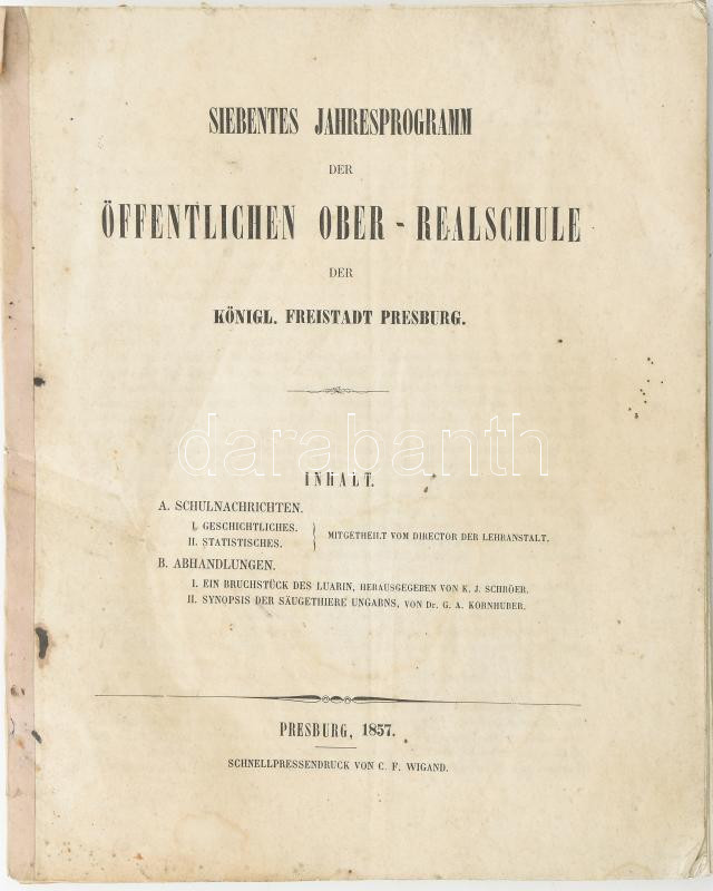 1857 Pozsony, Állami főreáliskola német nyelvű Iskolai értesítője (Sie... https://www.darabanth.com/en/463-Online-auction/463.0/Art-and-other-collectibles/Printed-Materials~2000038/1857-Pozsony-Allami-forealiskola-nemet-nyelvu-Iskolai-ertesitoje-Siebentes-Jahresprogramm-der~II3114476