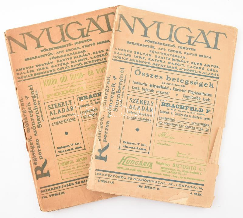 1915-1916 Nyugat VII. évf. 8. sz., 1915. április 16. + VIII. évf. 24. sz., 1916. karácsony. Szerk.: Ignotus, Ady Endre, Fenyő Miksa. Benne többek közt Móricz Zsigmond, Babits Mihály, Karinthy Frigyes írásaival. Kiadói papírkötés, sérült, széteső állapotban.