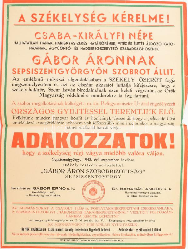 1942 A Székelység kérelme Sepsiszentgyörgyön a Gábor Áron szobor felállítására adománygyűjtő plakát 21x30 cm Szélén kissé sérült