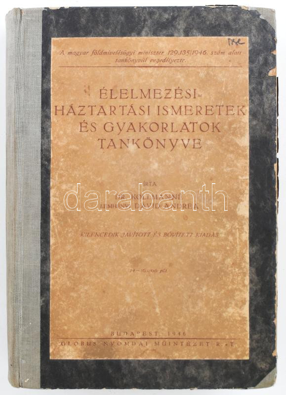 Description: Kollmanné lemhényi Dávid Andrea: Élelmezési-háztartási ismeretek és gyakorlatok tankönyve. Bp., 1946, szerzői kiadás (Globus-ny.), 551+(1) p. Kilencedik javított és bővített kiadás. Átkötött félvászon-kötésben, kissé sérült borítóval és fűzéssel.