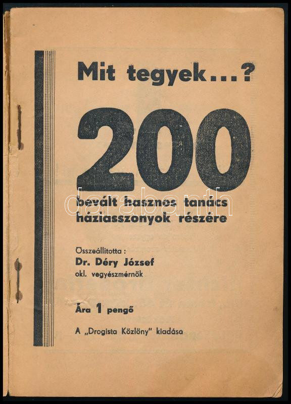Description: Most mit tegyek? 200 bevált hasznos tanács háziasszonyok részére. Összeáll.: Dr. Déry József. (Bp.), é.n. (cca 1930), Drogista Közlöny (Elek-ny.), 62+(2) p. Kiadói tűzött papírkötés, kissé viseltes, sérült borítóval.