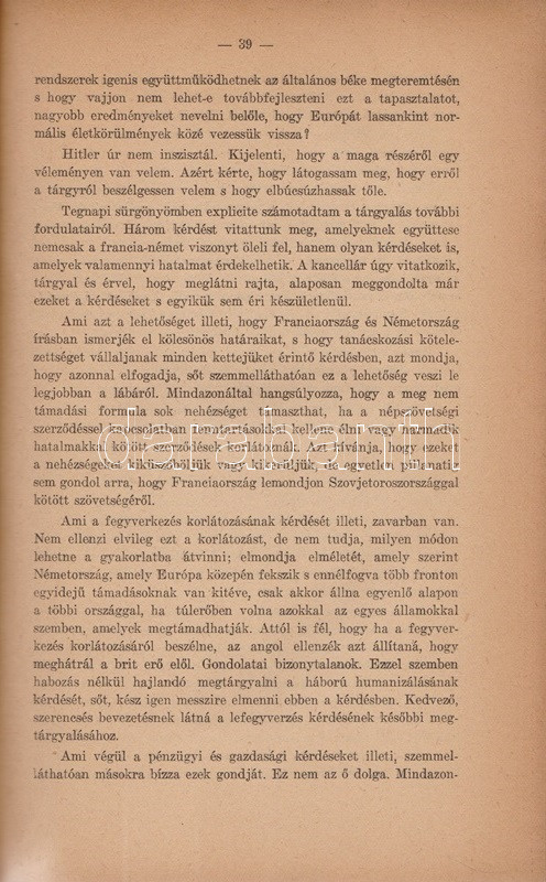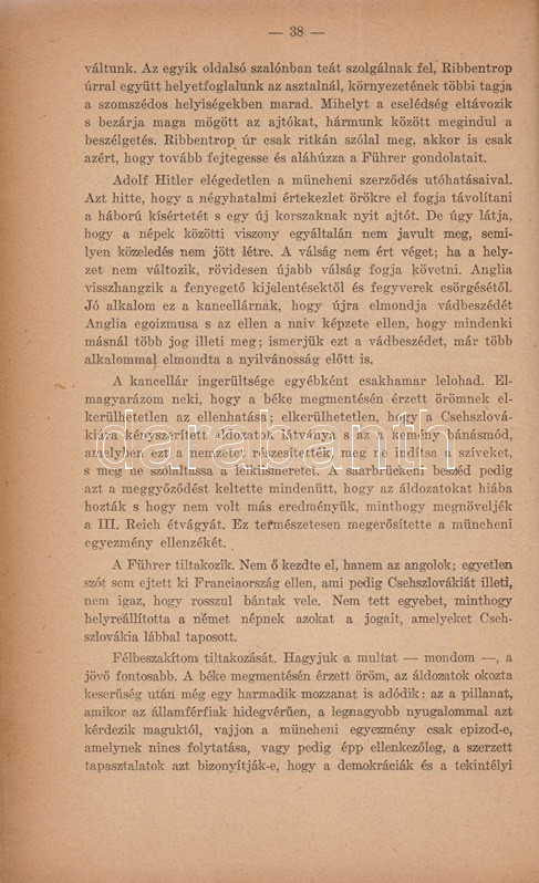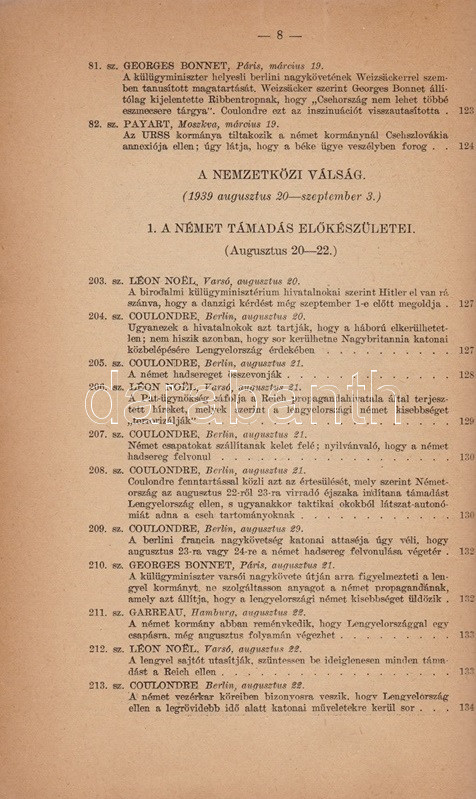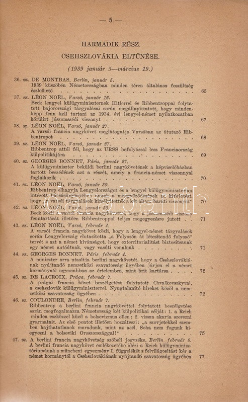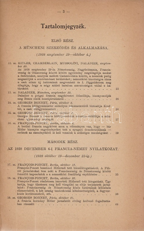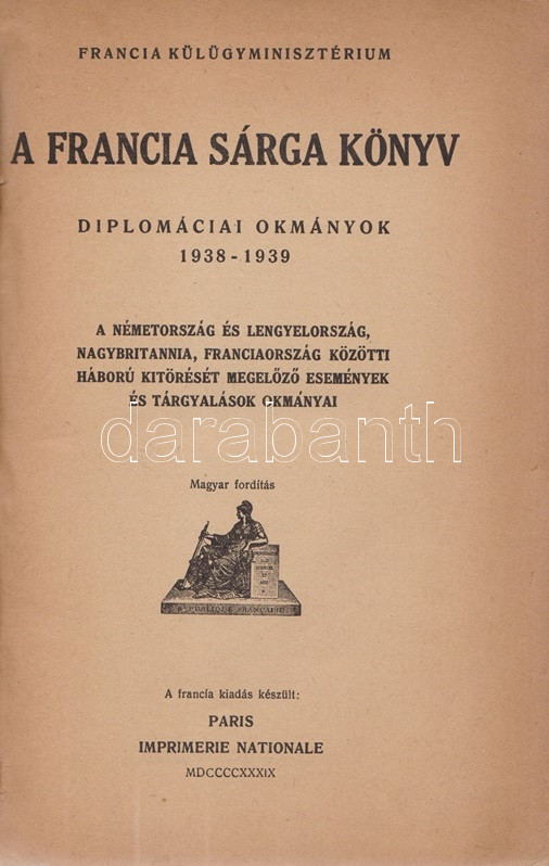 A francia sárga könyv. Diplomáciai okmányok 1938-1939. A Németország és Lengyelország, Nagybritannia, Franciaország közötti háború kitörését megelőző események és tárgyalások okmányai. Magyar fordítás. Budapest, 1939. Francia Külügyminisztérium (Pápai Ernő műintézete). 270 p. A francia diplomácia levélváltásai Adolf Hitler politikája, a német terjeszkedés, Csehszlovákia felosztása: a müncheni konferencia, valamint a háború kitörése kapcsán. Fűzve, sérült, enyhén hiányos kiadói borítóban, az első fedőborítón ,,Tiszteletpéldány" bélyegzés, verzóján kisebb javítás, a borítók sarkán kisebb hiány.