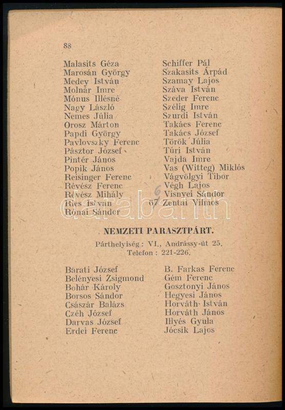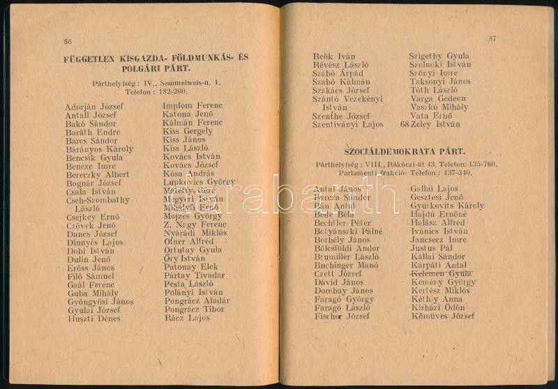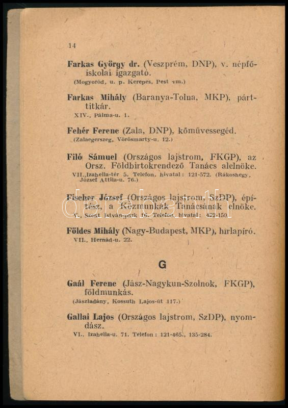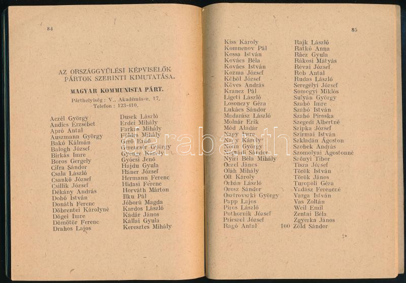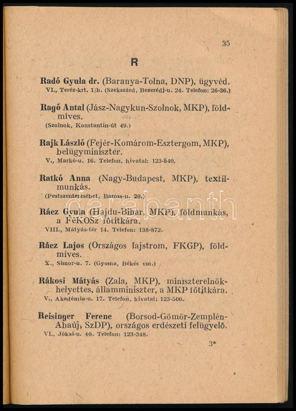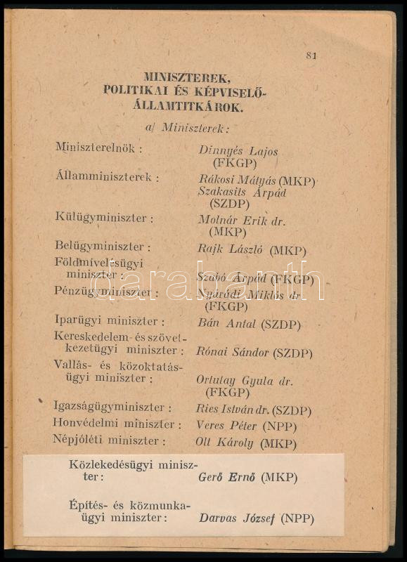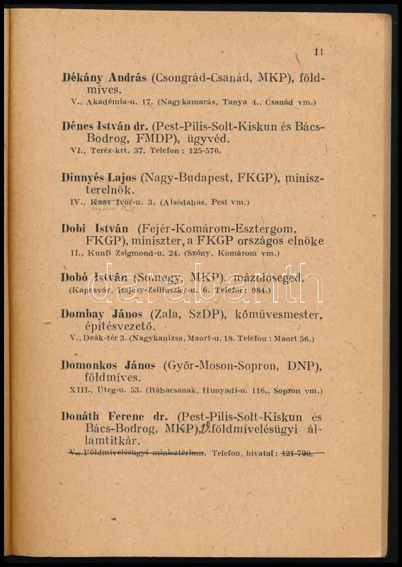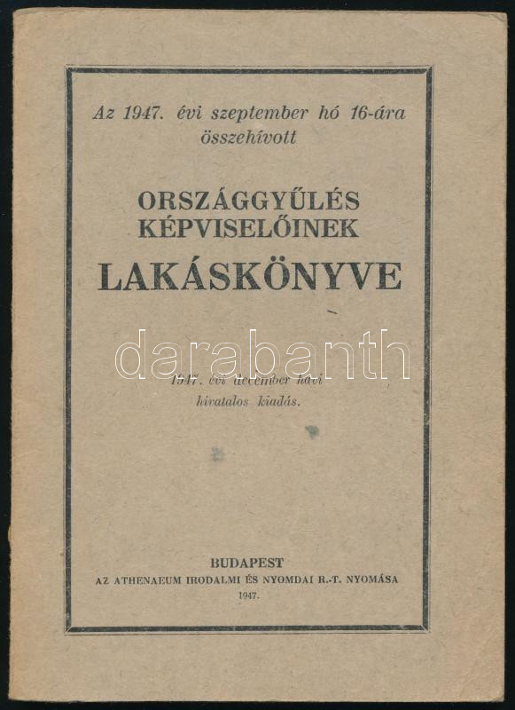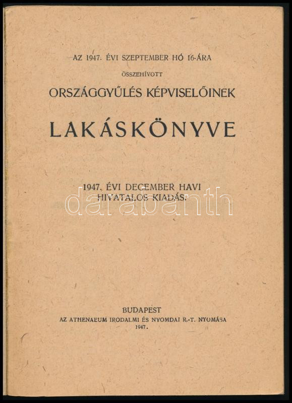 Az 1947. évi szeptember hó 16-ára összehívott Országgyűlés Képviselőinek lakáskönyve. 1947. december havi hivatalos kiadás. Bp., 1947, Athenaeum, 91 p. Benne Dinnyés Lajos, Dobi István, Rajk László, Rákosi Mátyás, Gerő Ernő és mások. Kiadói papírkötés, benne javításokkal és módosításokkal.
