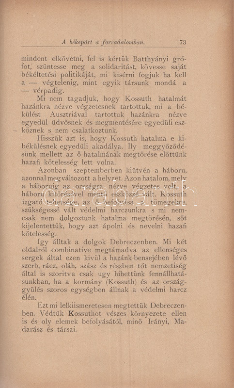 Kovács Lajos: A Békepárt a magyar forradalomban. Válaszul Irányi Dániel röpiratára. Budapest, 1883. Révai Testvérek kiadása (Rudnyánszky A. ny.) 130 p. Egyetlen kiadás. Kovács Lajos (1812-1890) politikus, publicista, Széchenyi István feltétlen híve, 1848 második felében közmunka- és közlekedésügyi miniszter. A politikai pályáját Erdélyben megkezdő Kovács Lajos 1848-1849-ben a radikális forradalmiságot, a republikanizmust, a Béccsel való végleges szakítást kerülő politikai irányzat, az úgynevezett Békepárt híve. Az Országos Honvédelmi Bizottmány időszaka alatt természetesen elismerte Kossuth Lajos vezető szerepét, de a függetlenségi szemléletű, radikális publicistákkal (Irányi Dániel), illetve kormánybiztosokkal (Madarász László) szemben állt. A hivatalosan párttá soha nem szerveződő - Kemény Zsigmond, Kazinczy Gábor és Kovács Lajos fémjelezte - Békepárt és az egyre radikálisabbá váló Kossuth-hívek közötti viszony a kormány Debrecenbe költözését követően mérgesedett el. Politikai vitairatunk érdekes bepillantást nyújt a szabadságharc politikai belharcaiba. A címoldalon és az ajánlás oldalán régi tulajdonosi bejegyzés, a címoldalon és verzóján régi tulajdonosi bélyegzés. Szentkirályi K 82.6. Korabeli félvászon kötésben. Jó példány.