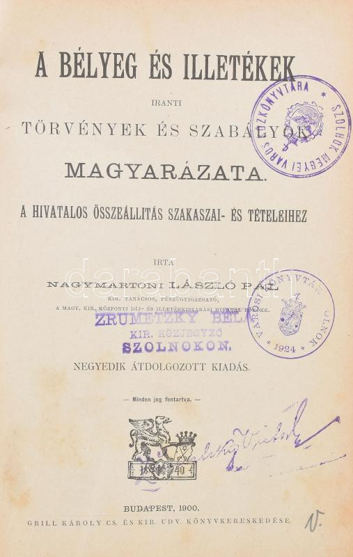 László Pál, nagymartoni: A bélyeg és illetékek iránti törvények és szabályok magyarázata. A hivatalos összeállítás szakaszai- és tételeihez. Bp., 1900, Grill Károly (Márkus Samu-ny.), 708 p. Negyedik, átdolgozott kiadás. Kiadói egészvászon-kötés, kissé viseltes, foltos, kopott borítóval, helyenként kissé foltos lapokkal, régi intézményi és tulajdonosi bélyegzőkkel (Zrumetzky Béla szolnoki kir. közjegyző, valamint fia, Zrumetzky Viktor (1880-1925), Szolnok polgármesterének névbélyegzőjével).