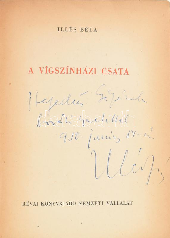 https://www.darabanth.com/en/463-Online-auction/463.0/Books/Books-Other-rarities~2000017/Illes-Bela-A-vigszinhazi-csata-Bp-1950-Revai-Hegedus-Geza-ironak-DEDIKALT-peldany-Potolt~II3117310