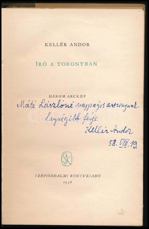 Kellér Andor: Író a toronyban. (DEDIKÁLT). Bp., 1958, Szépirodalmi Kön... https://www.darabanth.com/en/463-Online-auction/463.0/Books/Books-Other-rarities~2000017/Keller-Andor-Iro-a-toronyban-DEDIKALT-Bp-1958-Szepirodalmi-Konyvkiado-Elso-kiadas-Kiadoi~II3115057