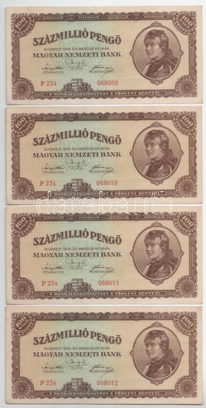 1946. 100.000.000P (4x) sorszámkövetők "P 234 068009 - P 234 068012" T...
