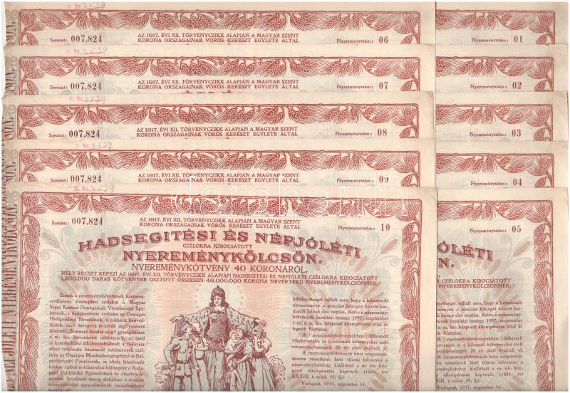 Budapest 1917. "Hadsegítési és Népjóléti nyereménykölcsön" nyereménykötvény 40K-ról, szárazpecséttel, felülbélyegzéssel (10x) sorszámkövetők T:VF
