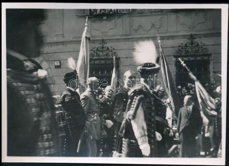 1938 Budapest, megyék küldöttei a körmenetben, díszmagyarban, hátoldalon feliratozott fotó, 6×9 cm