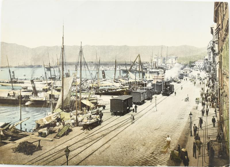 cca 1890 Fiume, kikötő hajókkal, gőzmozdonnyal, színes fotokróm nyomat, 21,5x15,5 cm / cca 1890 Fiume (Rijeka), harbour with ships, locomotive, photocrom print, 21.5x15.5 cm