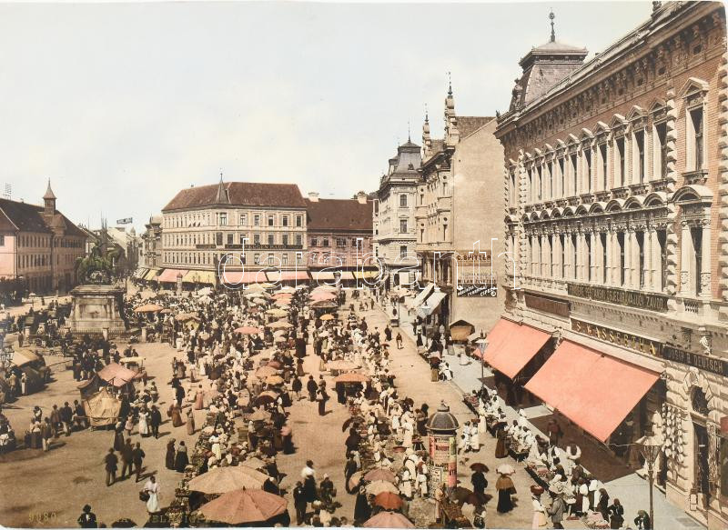 cca 1890 Zágráb, Jelačić bán tér, piac, üzletek és táblák, színes fotokróm nyomat, 21,5x16 cm / cca 1890 Zagreb, Ban Jelačić Square, market, shops and signs, photocrom print, 21.5x16 cm