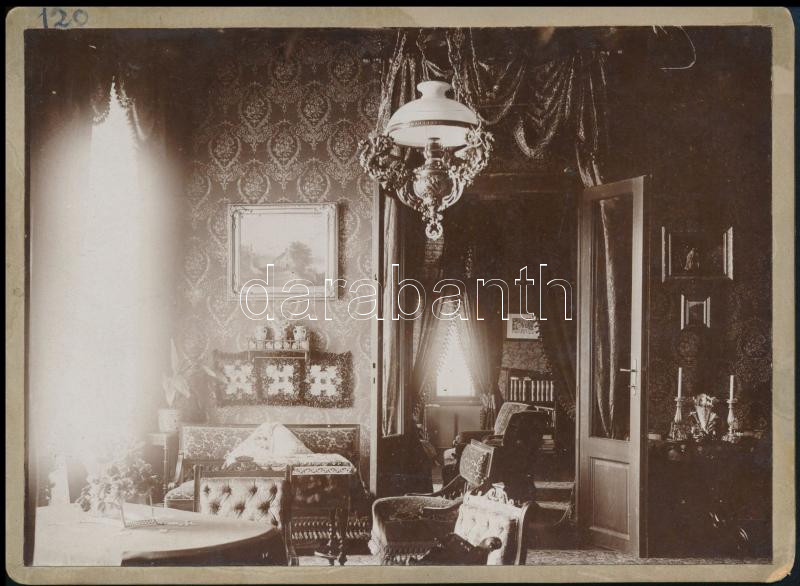 Description: cca 1910 Debrecen, Puky Gyula (1840-1919), Debrecen város és Hajdú vármegye főispánja lakásának enteriőrje, keményhátú fotó, a hátoldalon feliratozva, kisebb foltokkal, 13x18 cm