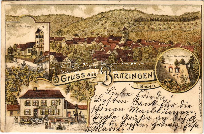 1901 Müllheim im Markgräflerland, Mille; Gruss aus Britzingen i. Baden, Gasthaus zur Krone, Ruine Neuenfels, Kirche u. Pfarrhaus. Verlag E. Erhard / general view, inn with fountain, castle ruins, church with parish. Art Nouveau with grape vines, litho (EK)