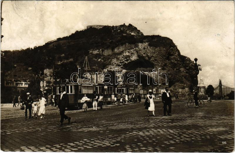 Description: 1927 Budapest XI. Gellérthegy, Gellért tér, Citadella és Barlangkápolna, 9 és 71-es jelzésű villamos Gschwindt likőrök és konzervek reklámmal, kerékpáros (Rb)