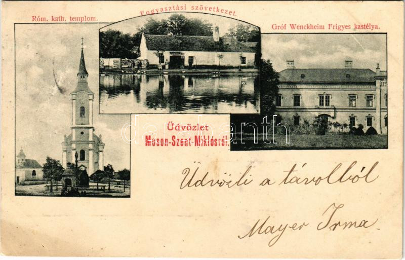 Mosonszentmiklós, Gróf Wenckheim Frigyes kastély, Római katolikus templom, Fogyasztási szövetkezet üzlete (fl)