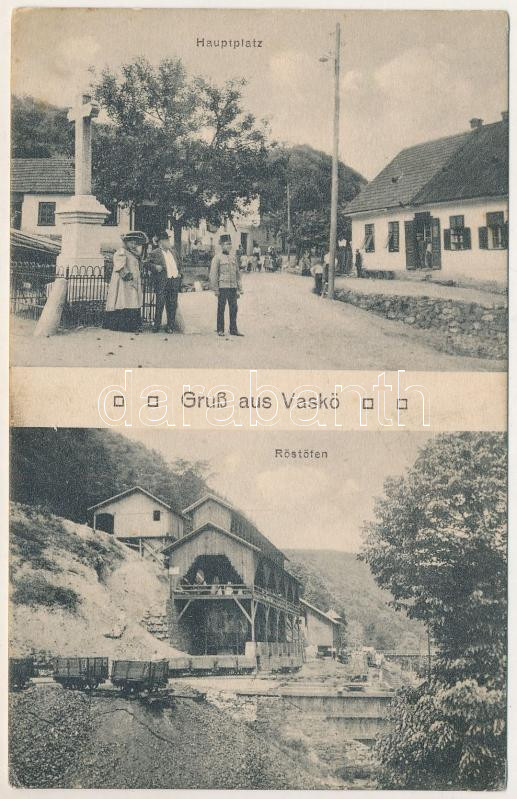 1913 Vaskő, Moravica-Eisenstein, Ocna de Fier; Hauptplatz, Röstöfen / Fő tér, üzlet, kemencék, bánya, iparvasút. Fotogr. Carl Szabonáry / main square, shop, furnaces, mine, industrial railway (EK)