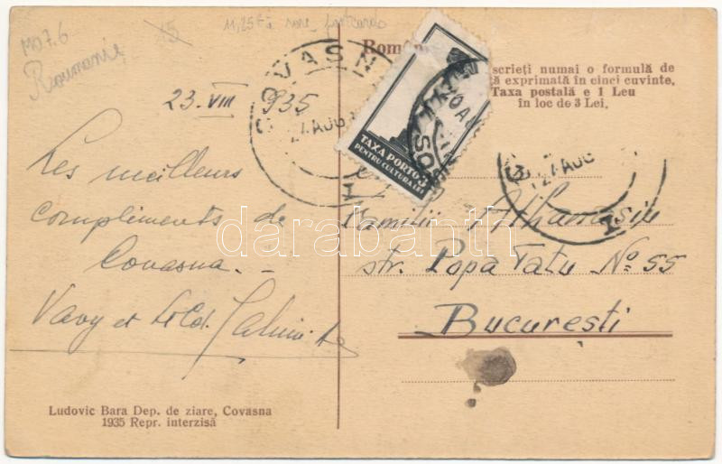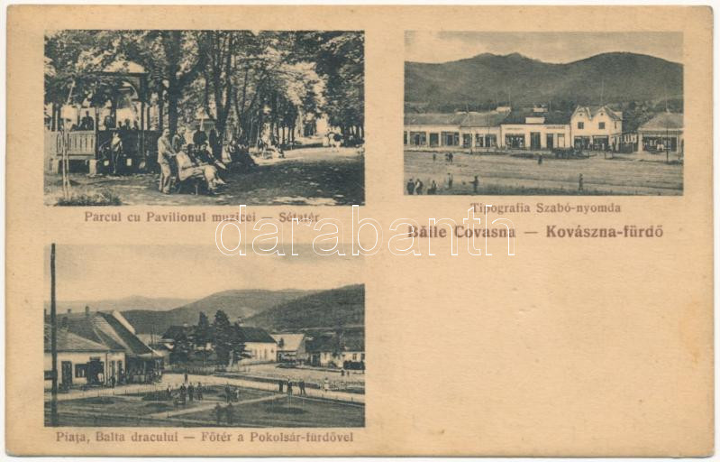 1935 Kovászna-fürdő, Baile Covasna; Parcul cu Pavilionul muzicei, Tipofrafia Szabó, Piata, Balta dracului / Sétatér, zenepavilon, Fő tér a Pokolsár fürdővel, Szabó nyomda / promenade, music pavilion, main square, spa, bath, printing house (EK)