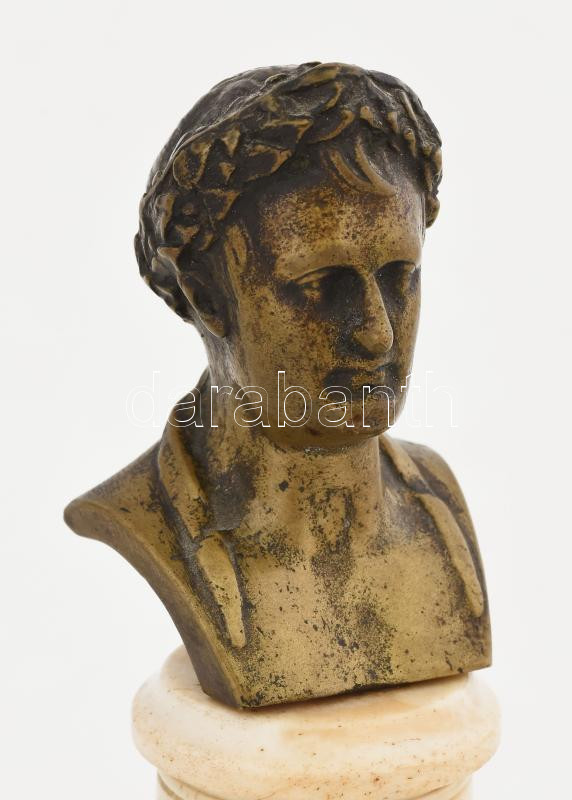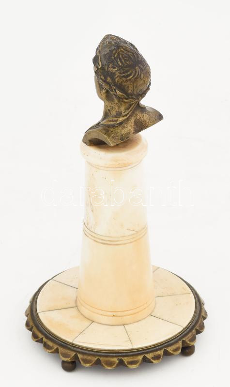 Antik Napóleon réz büszt, csont posztamens és talapzat résszel, 4 gömb lábon. Jelzés nélkül, kis kopással, m: 21 cm
