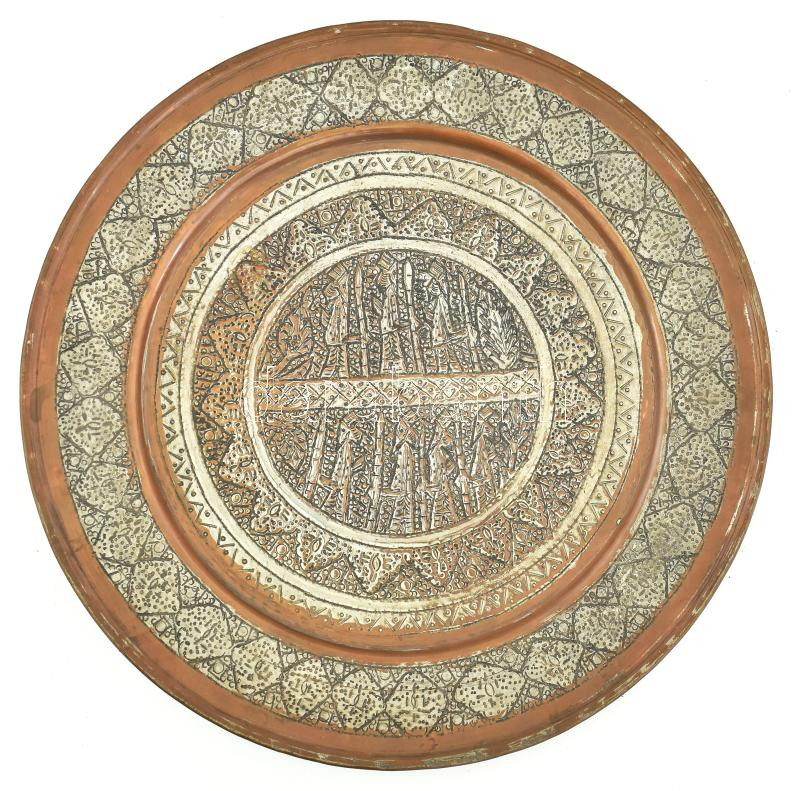 Szíriai damaszkuszi dísztál. Részben ónozott réz, poncolt mintákkal, j...
