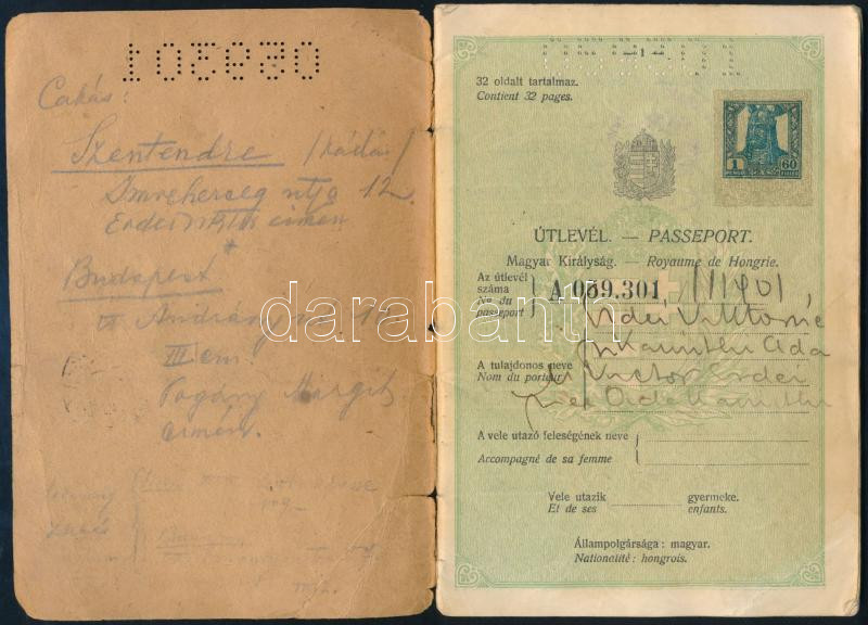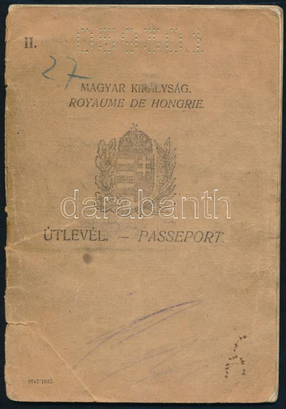 https://www.darabanth.com/en/464-Online-auction/464.0/Art-and-other-collectibles/Documents~1000020/1930-Magyar-Kiralysag-altal-kiallitott-fenykepes-utlevel-borito-gerince-szakadt~II3127313