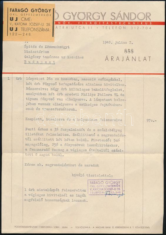 1948 Faragó György Sándor világítástechnikus fejléce számlája
