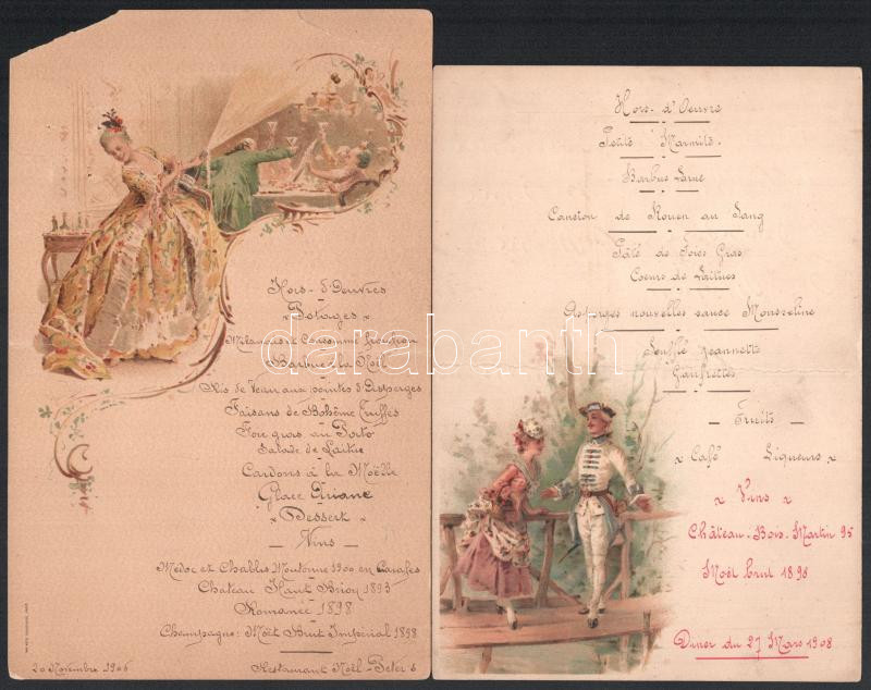 1906-1908 Párizs, 2 db éttermi menükártya, exkluzív borokkal és ételek... https://www.darabanth.com/en/464-Online-auction/464.0/Art-and-other-collectibles/Historical-documents-manuscripts~2000093/1906-1908-Parizs-2-db-ettermi-menukartya-exkluziv-borokkal-es-etelekkel-az-egyik-hatoldalan~II3103483