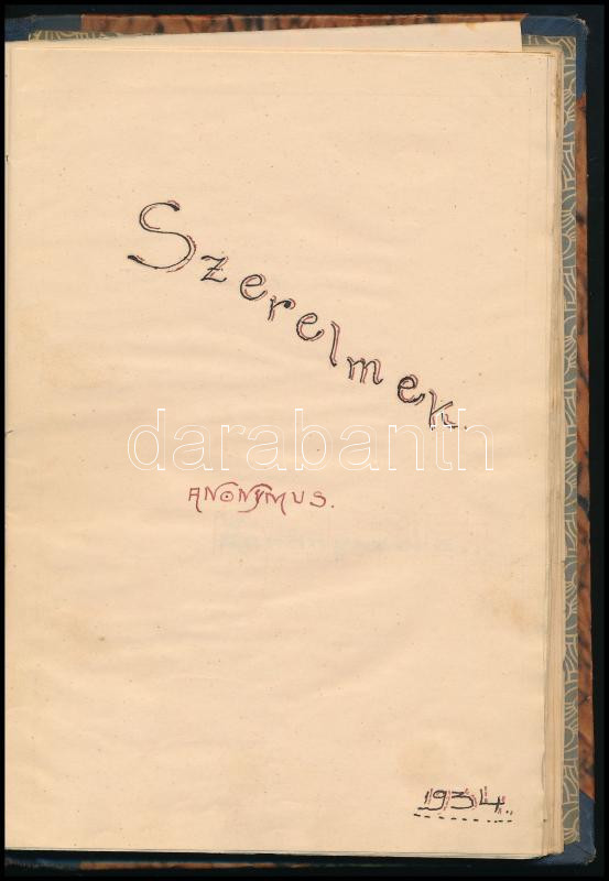 1934 "Anonymus: Szerelmek", régi napló, kb. 50 oldalnyi kézzel írt bejegyzéssel, versekkel, félvászon-kötésben
