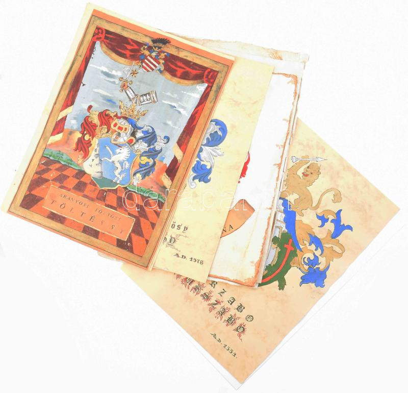 8 db címerrajz, közte Aranyosi Töttösi Töltéssy, Kismartoni és Szentmiklósi Wrchowszky, Budai Szabóky család, stb. Vegyes technika, klf. hordozó (bőr, papír, merített papír). Változó állapotban, 42x30 cm körüli méretben.