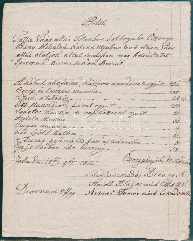 Ingatlanbecslés. Tata váraljai Istenben boldogult özvegy Bánj Mihályné ingatlanjának becsűje 1852-ből.