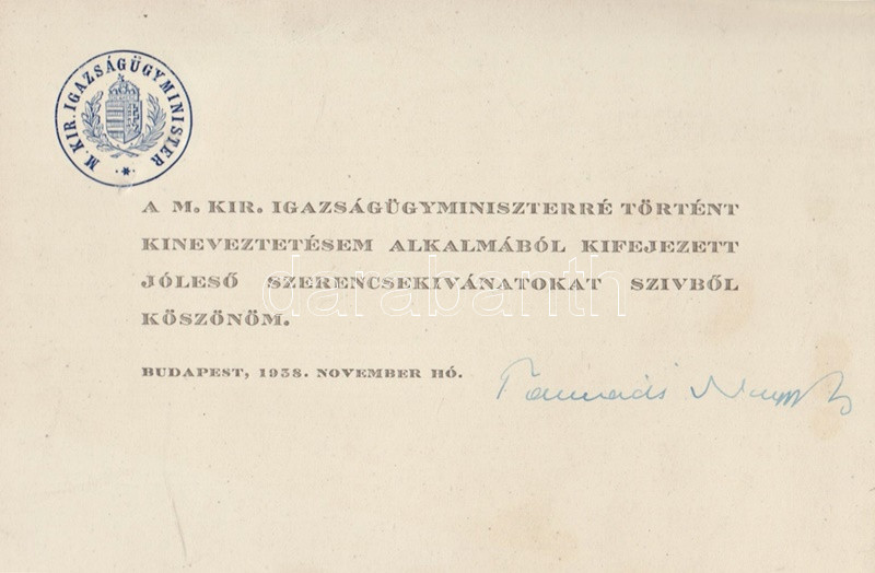Tasnádi Nagy András (1882-1956) igazságügy-miniszter saját kézzel aláírt üdvözlőkártyája miniszteri kinevezése alkalmából a minisztérium körbélyegzőjével hitelesítve. Kelt: Budapest, 1938. november hó. Mérete: 95x144 mm, 5 nyomtatott sor és aláírás. Szövege: ,,A M. Kir. igazságügyminiszterré történt kinevezetetésem alkalmából kifejezett jóleső szerencsekívánatokat szívből köszönöm. Tasnádi Nagy András." Tasnádi Nagy András jogász, politikus 1933-tól töltött be kormányzati pozíciókat, előbb államtitkári, majd 1938. november 15-től 1939. november 9-ig, az Imrédy- és a második Teleki-kormányban igazságügy-miniszteri pozíciót töltött be, minisztersége alatt fogadták el a második zsidótörvényt. 1939 és 1945 márciusa között a képviselőház elnöke, pozícióját megtartotta a nyilas hatalomátvétel után is, ezért 1945-ben háborús bűnösként halálra ítélték, mely ítéletet később életfogytiglani börtönbüntetésre változtattak. Jó állapotú nyomtatvány.