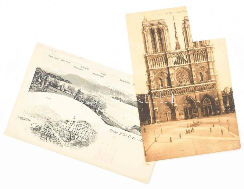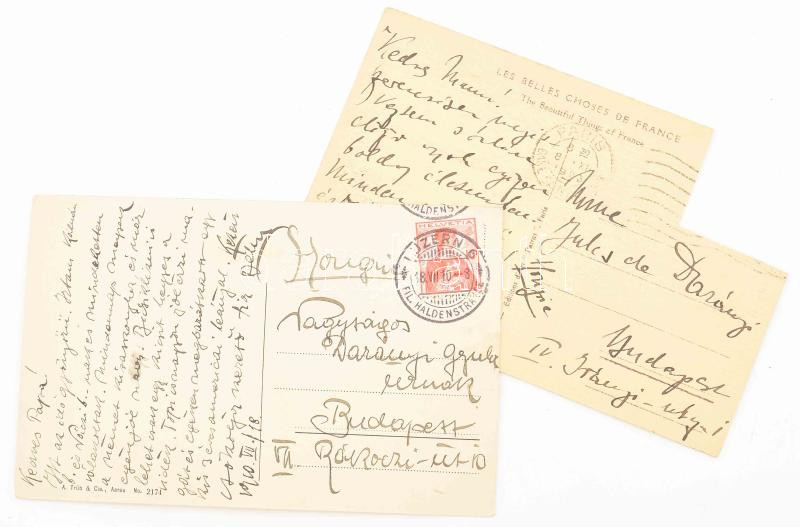 Description: cca 1910-20 Darányi Gyula ügyvédnek (1862-1931), Darányi Kálmán későbbi miniszterelnök rokonának által küldött 2 képeslap, egyik fia, későbbi vitéz Darányi Béla (sz. 1894), a "Futura" vezérigazgatója által írt, másik vágott