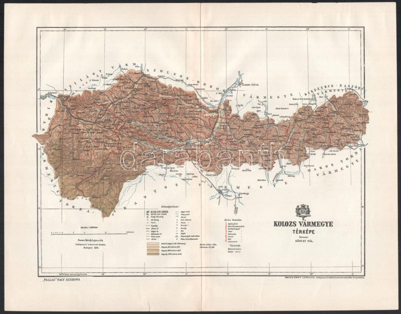 Description: 1894 Kolozs vármegye térképe, tervezte: Gönczy Pál, 1 : 565.000, Bp., Posner Károly Lajos és Fia, a Pallas Nagy Lexikona melléklete, apró lapszéli szakadással, 23,5x30 cm
