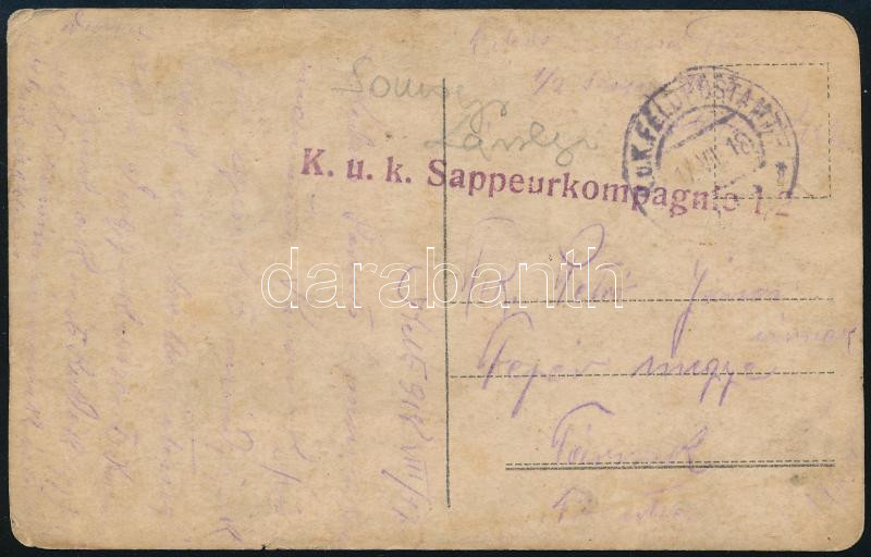 Description: 1918 Osztrák-magyar árkász katonák csoportképe, I. világháborús fotólap, megírva, "K. u. k. Sappeurkompagnie 1/2." bélyegzéssel, kissé viseltes, 14x8,5 cm