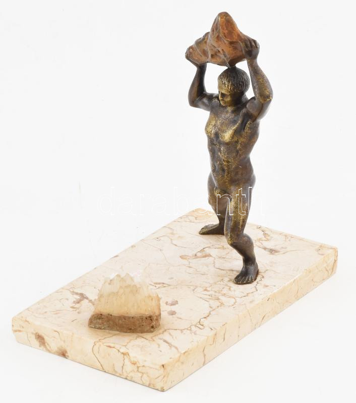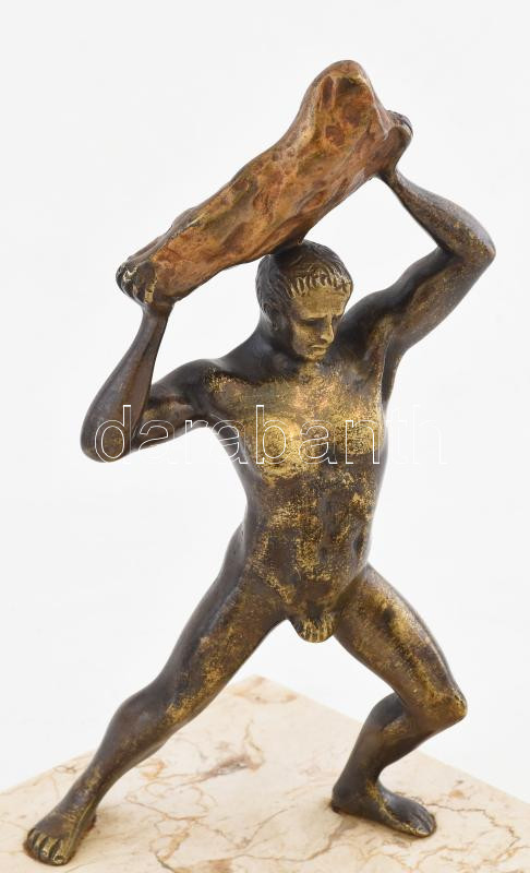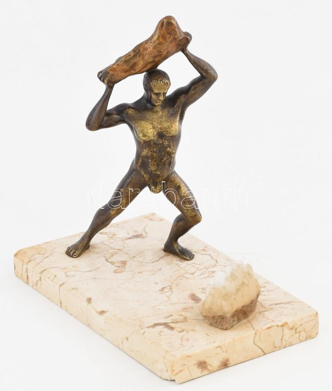 A sziklahajító. Bronz figura, márvány talapzaton, ásvány applikációval. Jelzés nélkül, talapzaton sérüléssel, 25x15x14 cm