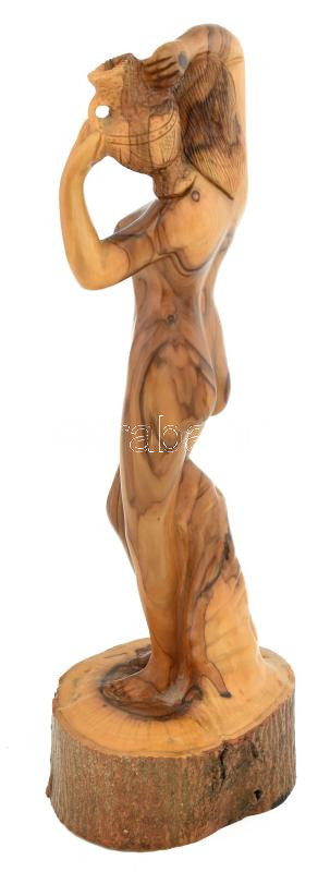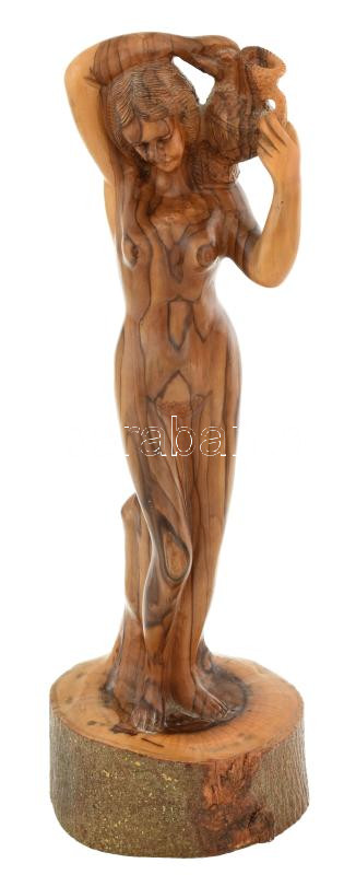 Lány korsóval. Faragott akt szobor, jelzés nélkül, m: 37 cm