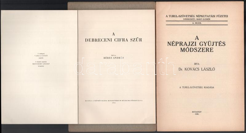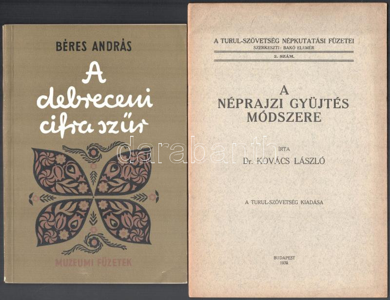 Béres András: A debreceni cifra szűr. Bp., 1955, Népművelési Minisztérium Múzeumi Főosztálya (Révai-ny.), 64 p. Első kiadás. A címlapot Varga Győző, a díszítő rajzokat Menyhárt József készítette. Kiadói papírkötés. + Kovács László: A néprajzi gyűjtés módszere. Turul-Szövetség Népkutatási Füzetei 2. Bp., 1939, Turul Szövetség. Kiadói papírkötés.