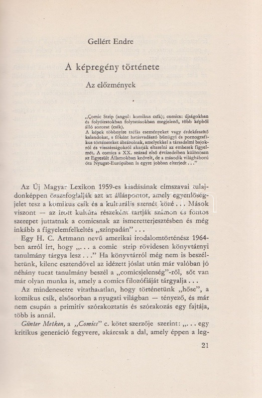Gellért Endre: A képregény története. Budapest, 1975. Tömegkommunikációs Kutatóközpont (Petőfi Nyomda, Kecskemét). 103 + [1] p. + 28 t. (I-LV-ig számozva). Egyetlen kiadás. Az első rendszeres áttekintés a képregényművészet történetéről, készült 1000 példányban. Gellért Endre alapos áttekintése előtt Hernádi Miklós szociológus ellenséges hangú, politikailag motivált kultúrkritikai bevezetője, melynek értetlenségét hamar feledteti Gellért Endre fontos szaktanulmánya. A táblákon elhelyezett képanyag döntően a műfaj amerikai, kisebb részében francia példáiból válogat. (A Tömegkommunikációs Kutatóközpont Szakkönyvtára, 28. kötet.) Fűzve, kiadói borítóban. Jó példány, ritka.