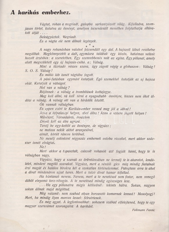 Karikás. Művészeti, társadalmi folyóirat. Szerkeszti: Folkmann Ferenc. Megjelenik minden hónapban. I. évfolyam, 1. szám. (1932. július.) (Budapest, 1932. ,,Karikás" Kiadóvállalat - Arany János Irodalmi és Nyomdai Műintézet Rt.) 20 p. Folkmann Ferenc színpadi szerző rövid életű képzőművészeti és irodalmi revüje az első két szám erejéig jelent meg ,,Karikás" címmel, a folyóirat a harmadik számtól ,,Művész Élet" címmel folytatódott. Oldalszámozáson belül számos szövegközti felvétellel, kortárs szobrok, festmények reprodukcióival. Fűzve, illusztrált, foltos kiadói borítóban.