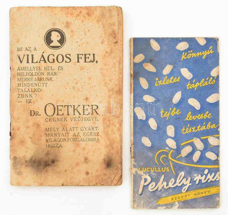 2 db receptfüzet: Dr. Oetker receptek, 96 p. + Lucullus Pehelyrizs receptkönyv, 32 p. Tűzött papírkötés, foltos, rossz állapotban.